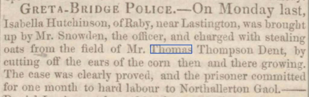 Theft from my ancestor, Thomas Thompson Dent. In 1842, Isabella Hutchinson, aged 22, stole oats from his field. Verdict: guilt, one month hard labour. Thomas was a wealthy man so I’m sure he could have spared those oats. However, Isabella was a serial offender. Three years earlier she was convicted for larceny and sentenced to three months in prison.