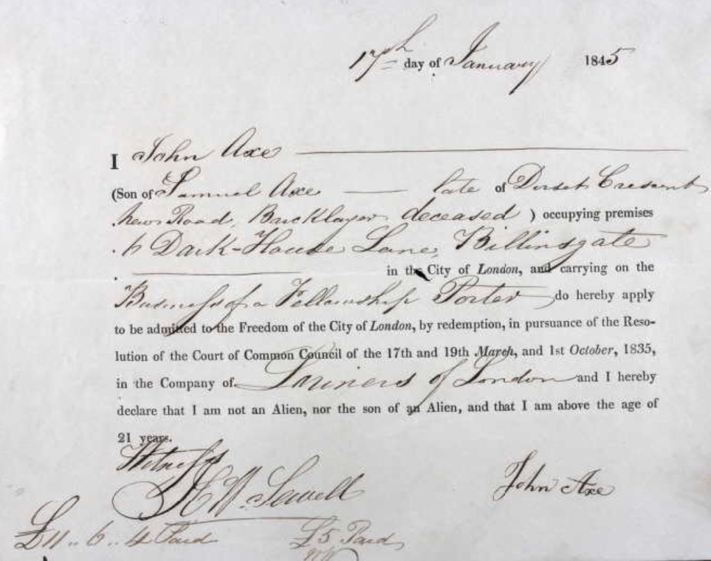 On 17 January 1845 Samuel’s youngest son, John, paid £5 to acquire the ‘Benefits of a Fellowship Porter’. In other words, he could trade in ‘measurable goods’ such as coal, grain, flour and salt, overseeing their transportation from trading ships to dockside warehouses. This was a good position with the opportunity to make considerable sums of money.
