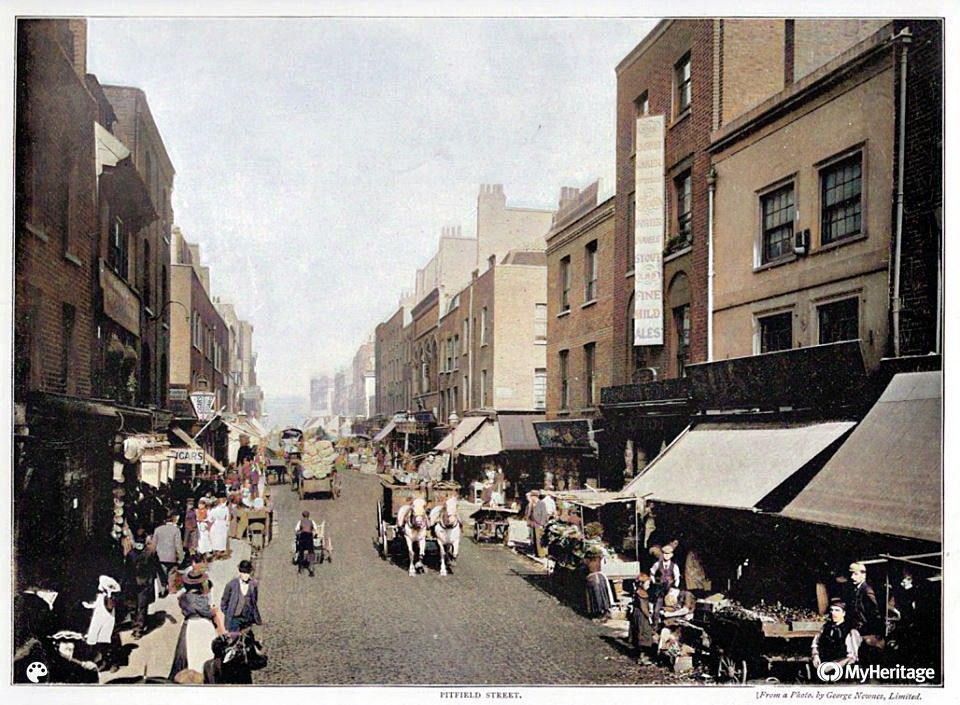 Colourised, Pitfield Street, Hoxton, London, 1896 – buildings built by Samuel? I love this image, it’s so full of life.