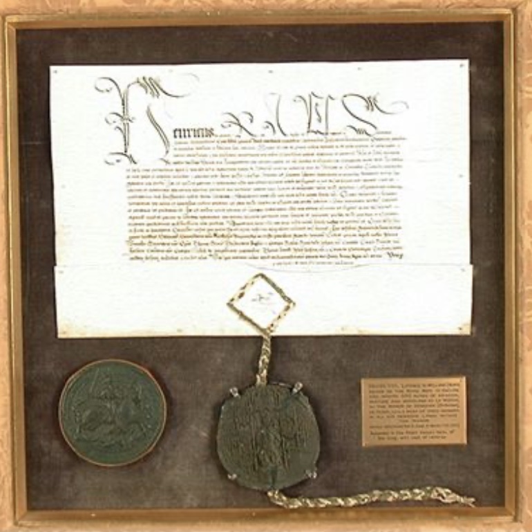 Sir William was a courtier of Henry VIII and High Sheriff of Gloucestershire in 1518 and 1526. In 1511, he was appointed an Esquire for the Body – a personal attendant – of Henry VIII. At this time, the king granted Sir William the honour to empark 500 acres of Dyrham, with exclusive hunting rights. Pictured, (Wikipedia), the charter.