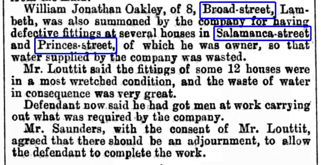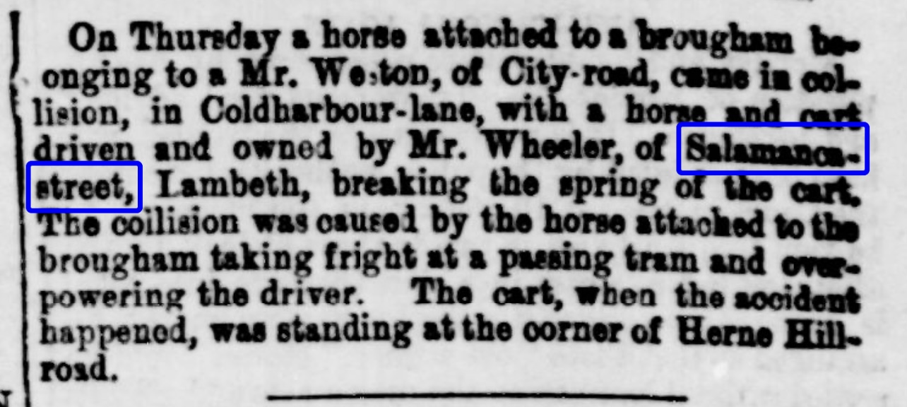 In 1884, the newspapers reported transport developments near my 3 x great grandmother Annie Wheeler’s street, Salamanca Street, including widening the South-Western Railway. These reports offered a reminder of how noisy and polluted the street could be.