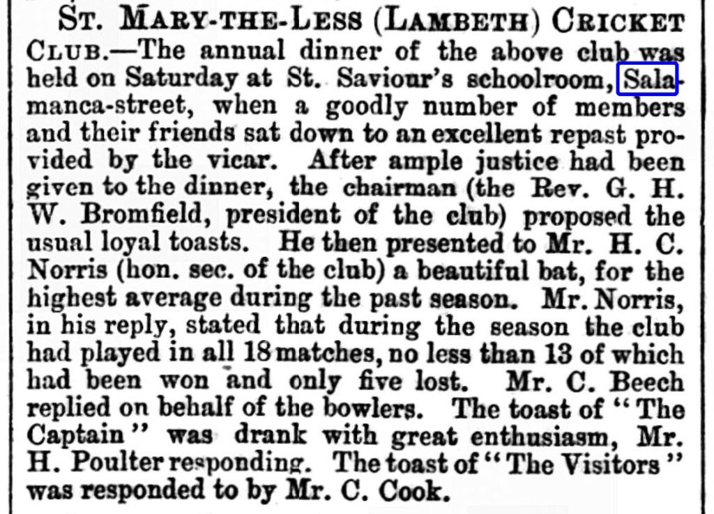 With the rats, leaking water pipes, crumbling floorboards and overflowing sewers in my 3 x great grandmother Annie Wheeler’s street, Salamanca Street, it seems incongruous that in December 1881 the local cricket club were holding their annual dinner in the local school, only a stone throw’s away. Yet, they were. A snapshot of the dichotomy of the Victorian era.