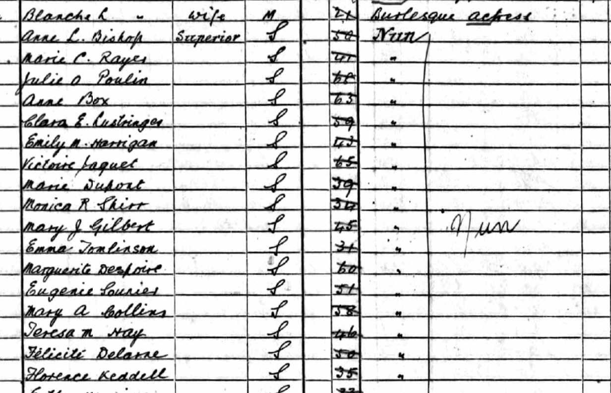You find some wonderful things in the censuses. Lambeth, 1891, here’s a burlesque actress living next door to a convent of nuns.