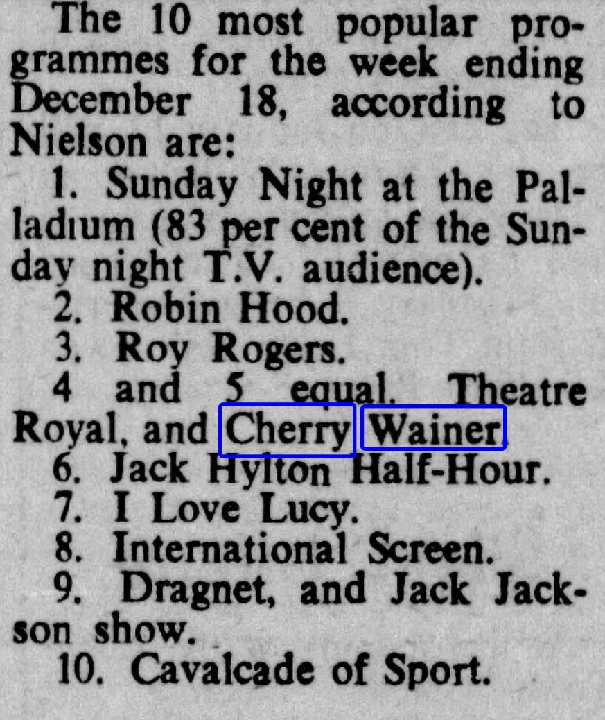 From January 1956, more on Cherry’s legs and shoes, and the upward trend in her career. Less than a year after making her television debut, she was becoming a fixture on television.