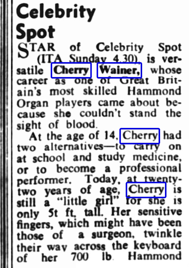 I’m researching the career of musician Cherry Wainer and the 1950s-1960s music scene.
