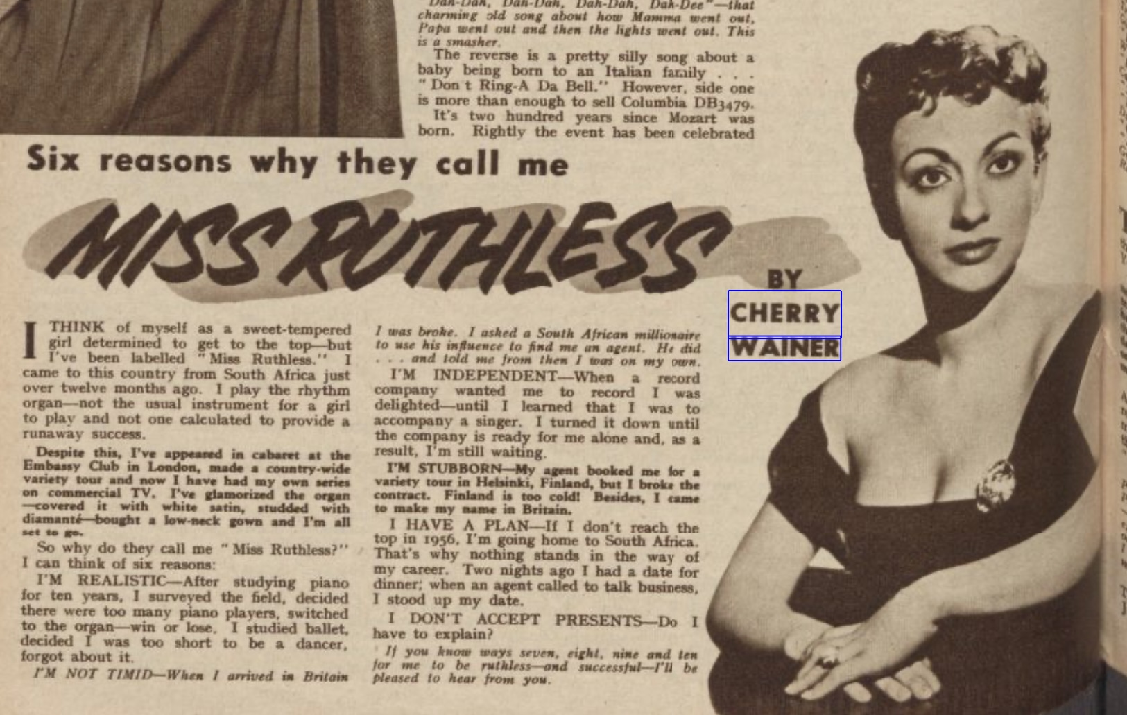In May 1956, Cherry expressed how determined she was to succeed. Indeed, Picturegoer revealed that Cherry was known as “Miss Ruthless”.