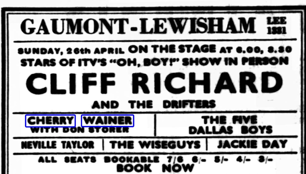 This advertisement from April 1959 highlights Cherry’s career at that time, sharing a bill with Cliff Richard and the Shadows (then billed as the Drifters) and other regulars from the television series Oh Boy!