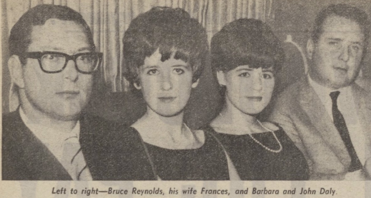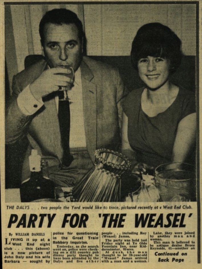 Great Train Robbery. Detectives are looking for Bruce Reynolds, his wife Frances, and Barbara and John Daly. Frances and Barbara are sisters. Reports suggest that Mrs Daly, who is pregnant, and her husband stayed at a seaside hotel. They arrived in a racing green Jaguar and paid their bill, £99 18s, all in fivers.