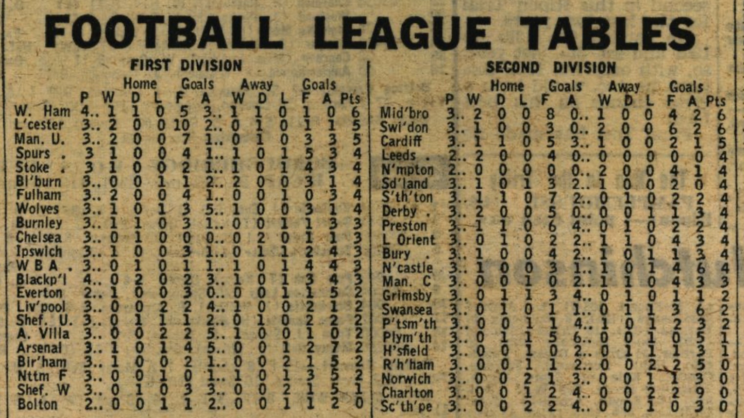 Football: Match of the Day – Leicester 7 Arsenal 2. Other results – Liverpool 1 Blackpool 2, Manchester United 5 Everton 1, Spurs 4 Nottingham Forest 1. Top three after three games – Leicester, Manchester United, Spurs. No team has a 100% record.