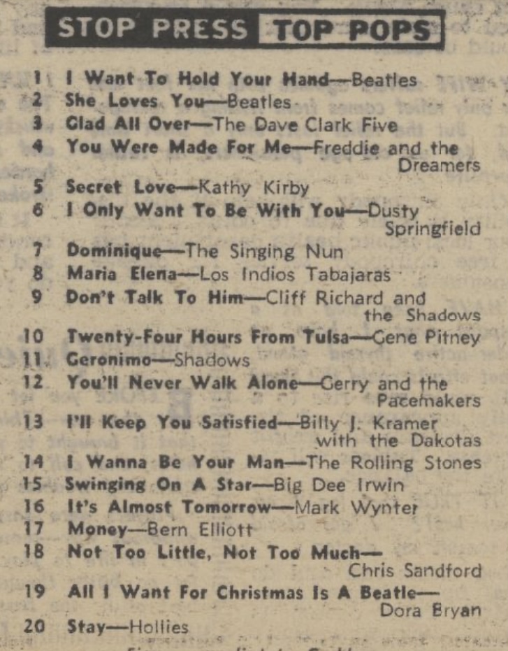 After a bumper 1963 in Discland, what will happen in 1964? We asked Parlophone boss George Martin, the man who produces all the Beatles’ hits. He said, “I don’t think there will be much of a change. The Beat mood will continue and spread more widely. The trend towards Beat will become part and parcel of the music scene. At the same time, there will still be the good ballads. There will be more groups too, but only the good ones will break through.”