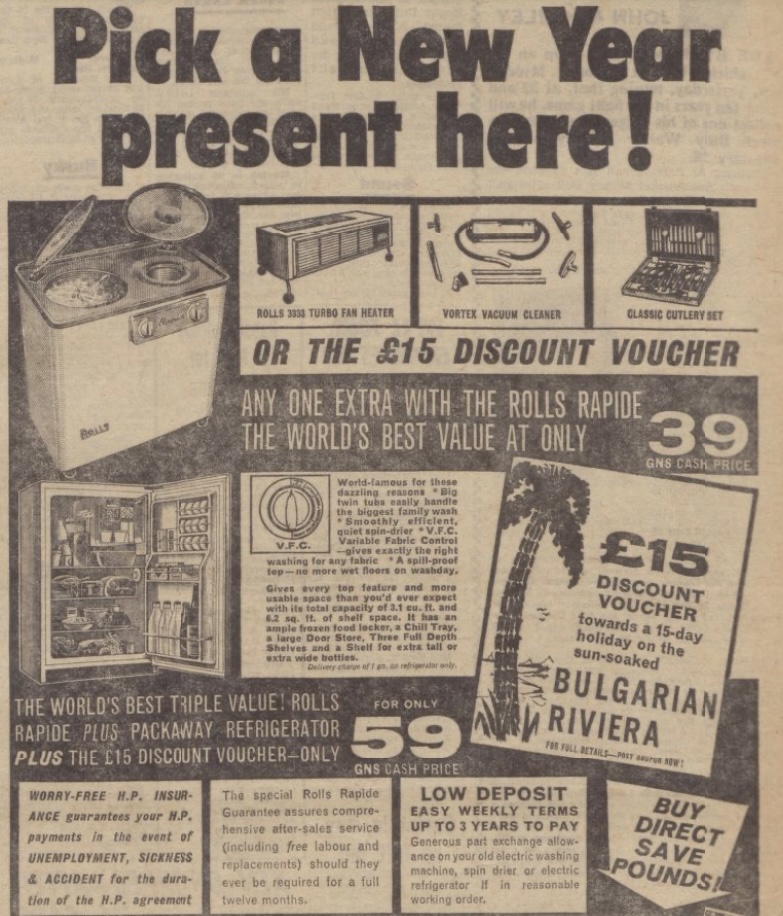 Television highlights: No Star on the Way Back – Contemporary Nativity. Sunday Night at the London Palladium – all-star show organised by the Stars Organisation for Spastics. Play – One Night of the Year with Kenneth Cope and Warren Mitchell.