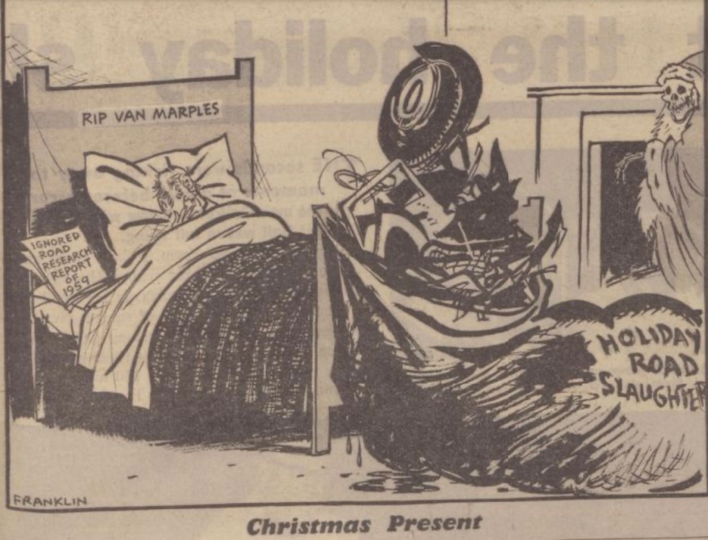 An inquiry into the Christmas road death toll of 120 is anticipated. It’s suspected that many of these deaths were due to drivers being incapacitated by alcohol. The use of “breathalyser” drunkenness detectors is a popular proposal. However, Transport Minister Ernest Marples has been reluctant to implement road safety measures in the past.