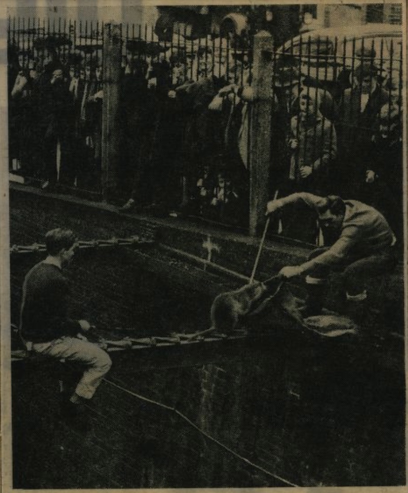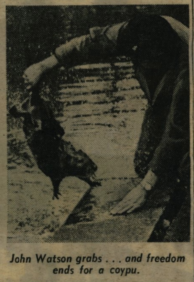 Using a sack and an umbrella, John Watson and Ken Brightwell captured two of the coypus that had escaped from London Zoo. They captured the coypus when someone spotted the 2 foot long rat-like animal running along a girder 20 feet above a canal at Maida Vale. A third coypus is still on the loose.