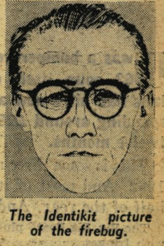 A firebug is on the loose in the West Country. Over the past eighteen months he has raided at least twenty-four top floor flats, robbed them and set them ablaze. The raids have been in Exeter, Newton Abbot, Plymouth, Weymouth, Dorchester, Gloucester, Exmouth and Clevedon. The firebug is about 5 foot 8 inches tall, between 45 and 50, has receding brown hair and wears horn-rimmed glasses.