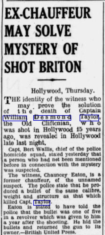 Chauncey Eaton was Charlotte Shelby’s chauffeur. If he’s talking about the murder weapon here that suggests either Charlotte Shelby, Mary Miles Minter, or a person with access to Charlotte’s gun killed William Desmond Taylor.