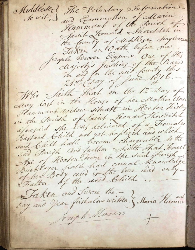 It would appear that all was not well with Samuel and Grace’s marriage because on 21 June 1816 Maria Hammont, single woman, petitioned the parish with the claim that ‘Samuel Axe, bricklayer of Hoxton Town gained carnal knowledge of her body.’ Maria gave birth to a bastard female on 12 May 1815 at her mother’s house in Hoxton Fields. The outcome of her petition is not recorded. However, Samuel was a wealthy man so hopefully he supported his child.
