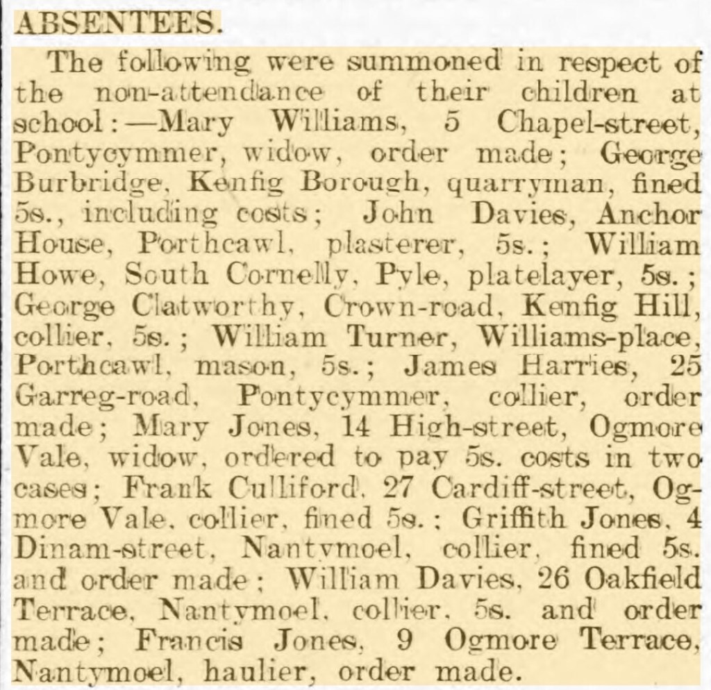 In 1901 William was still working in the quarry and his family were living on Porthcawl Road, South Corneli. Now, they had a four-roomed house. They also had four more children: William, born in 1892, Margaret, born in 1894, Priscilla, born in 1897 and Edith, born in 1899. Along with Elizabeth and Mary Ann, all were living at the house. William was now bilingual; he could speak Welsh and English. And although his mother, Mary, had died in 1897, his father, William, still lived next door.