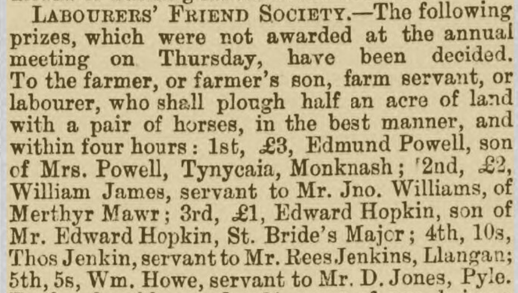 On 13 November 1876 William won five shillings for plowing half an acre of land with a pair of horses within four hours. Five shillings was the equivalent of a day’s wages for a skilled tradesman.