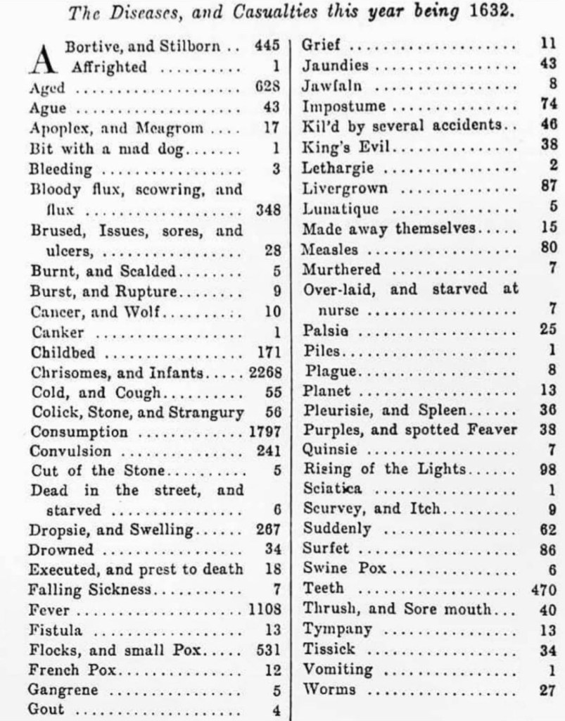 Along with the pestilence, our ancestors died from a range of diseases and illnesses. Here is an example from 1632 with a few definitions.