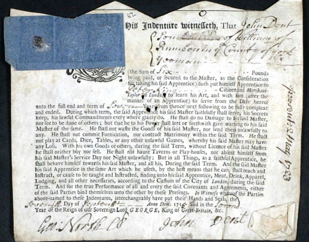 On 7 September 1715 John Dent became an apprentice merchant tailor to Peter King of York. Trade directories reveal that the Dents did branch out into the clothing trade with stores in Leeds. They also held on to their lands in Yorkshire.