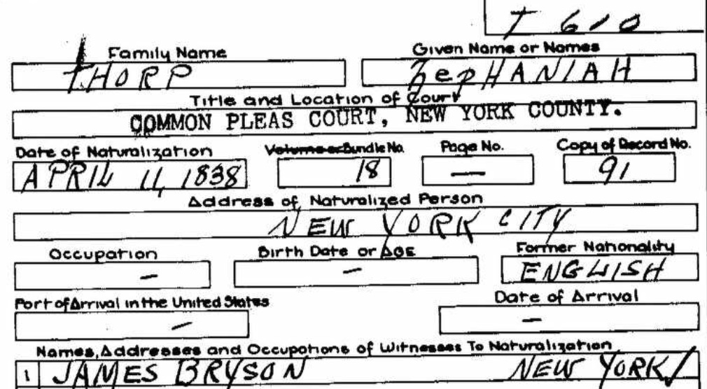 On 11 April 1838 at the Common Pleas Court in New York, Zephaniah and Mary applied for naturalisation. The application, sponsored by James Bryson, was granted and Zephaniah settled his family in Brooklyn.