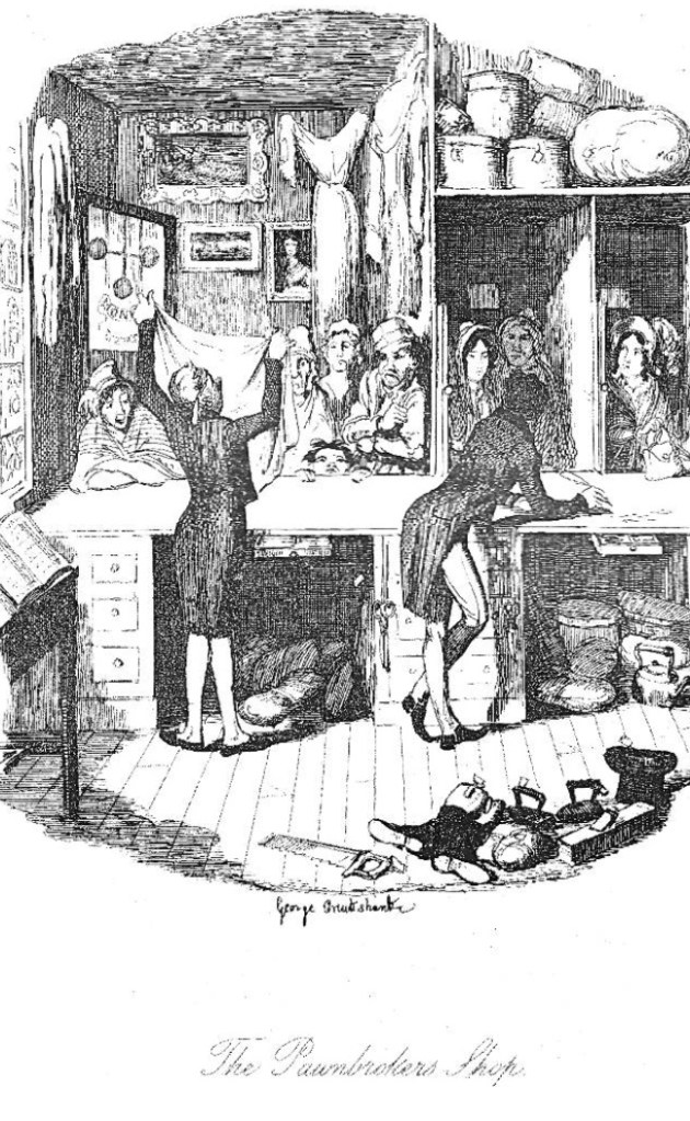 The entrance to a pawnbroker’s shop was usually via a side-street. In Sketches by Boz, Charles Dickens offered this description of a pawnshop near Drury Lane, ‘which affords a side entrance for the accommodation of such customers as may be desirous of avoiding the observation of the passers-by, or the chance of recognition in the public street’. The door, ‘half inviting, half repelling the hesitating visitor, who, if he be as yet uninitiated, examines one of the old garnet brooches in the window for a minute or two with affected eagerness, as if he contemplated making a purchase; and then cautiously looking round to ascertain that no one watches him, hastily slinks in…’