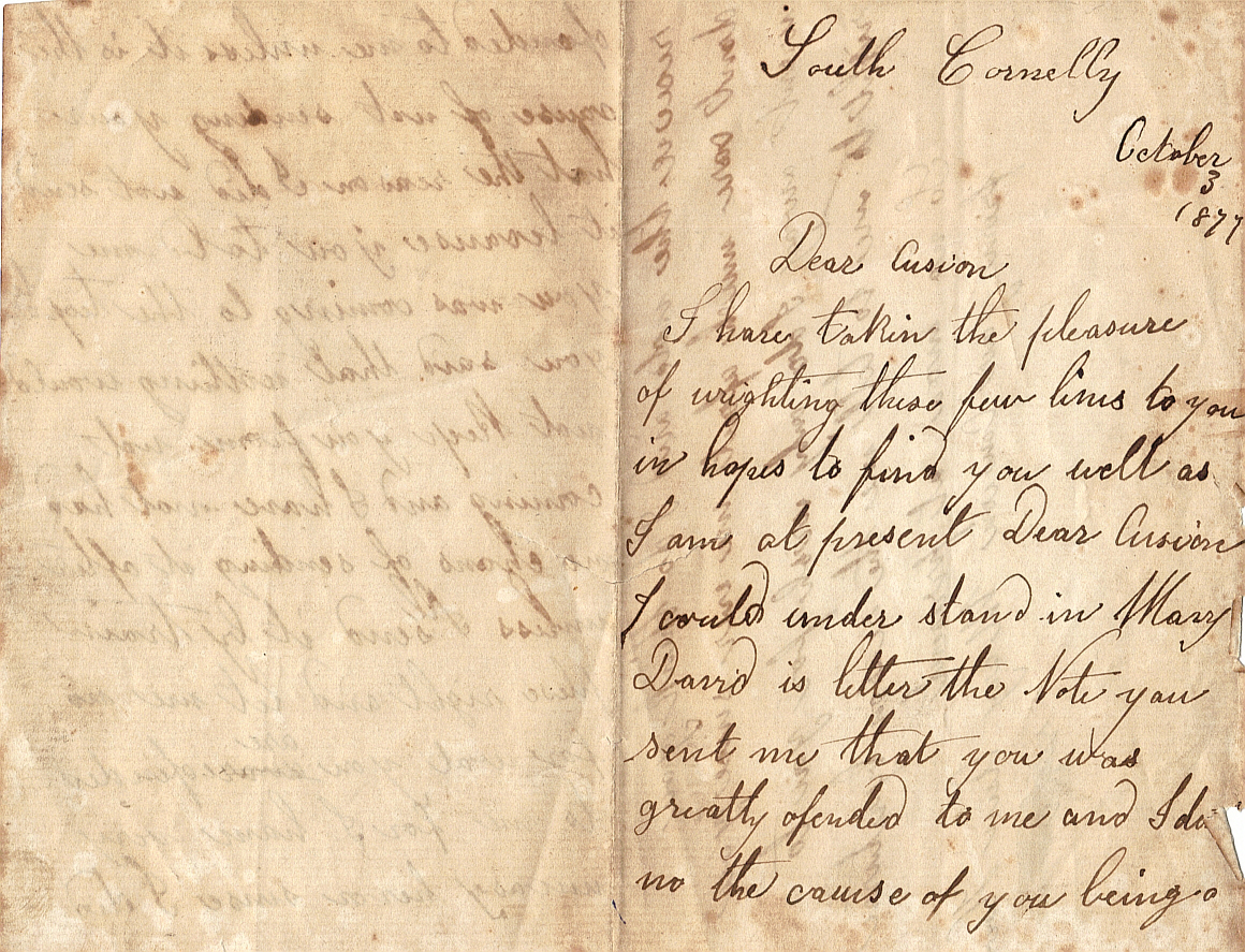 I have taken the pleasure of writing these few lines to you in hopes to find you well as I am at present. Dear Cousin I could understand in Mary David’s letter the note you sent me that you was greatly offended to me and I don’t know the cause of you being so offended to me unless it is the cause of not sending your hat. The reason I did not send it because you told me you was coming to the tea party. You said that nothing would not keep you from not coming and I have not had no chance of sending it after unless I send it by train. Please write and let me know for what you are offended to me for. I am very uneasy ever since I did receive the note and I do think you don’t care much about me ever since you went away. I do only wish for you to write to me to tell me the reason by return.