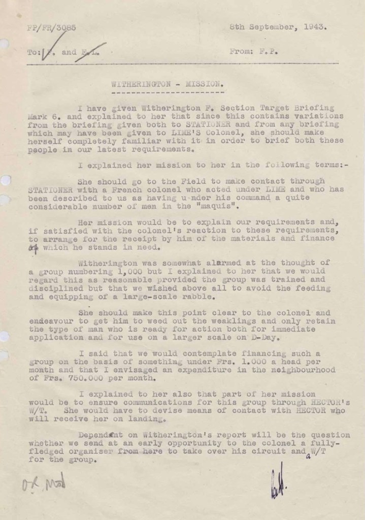 8.9.1943. Pearl received details of her first mission, to make contact in France with a French colonel and his Maquis group of 1,000 men.