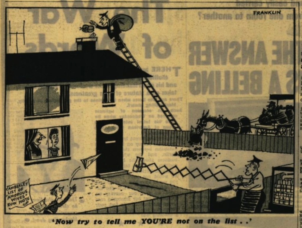 Fighting broke out between women on a council estate in Frimley where twelve housewives are said to be too amorous. The twelve are on a secret list issued to council workmen. There are demands for the women’s names to be made public. For their safety, council workmen are now working in pairs. Mrs Moria Spencer, a 25 year old mother of seven, said, “We have our own ideas about who should be on that list. I used to make a cup of tea for the workmen, but never again.”
