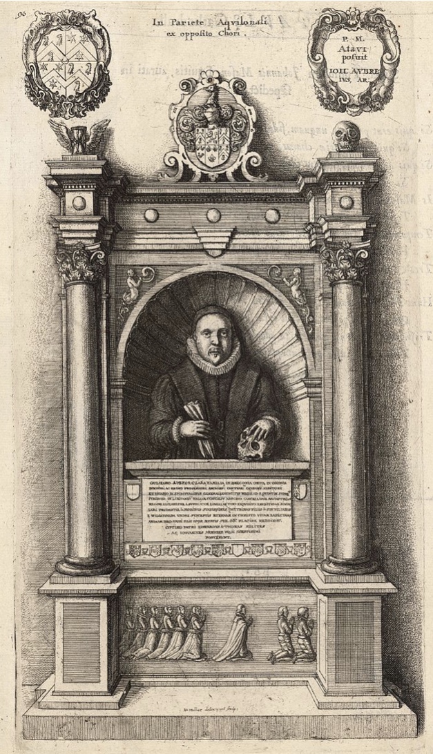 An engraving of Dr William Aubrey’s monument by Wenceslaus Hollar. William’s six daughters and wife are depicted on the bottom, along with two of his sons. It is not known why his third son was not depicted.