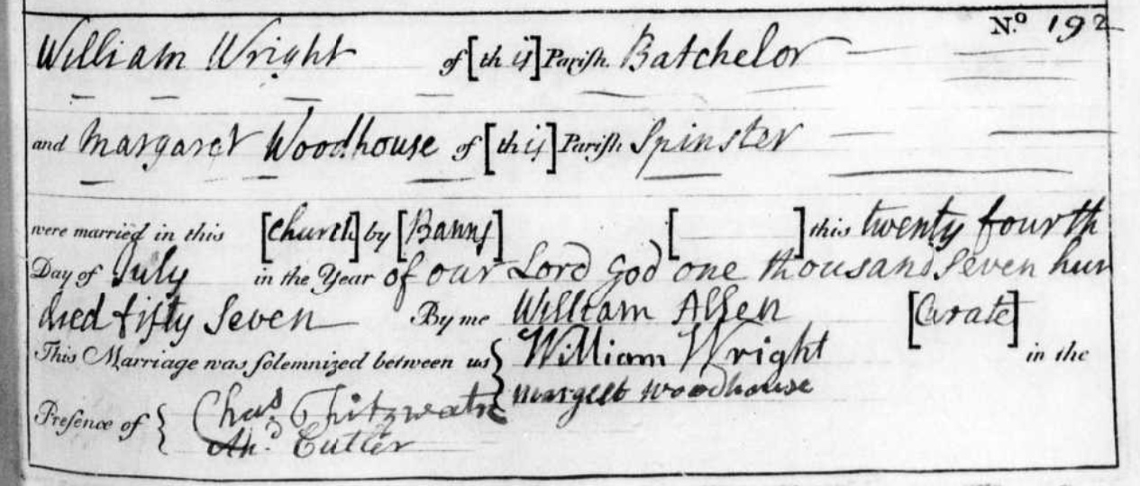 It’s always nice when you discover your ancestors’ signatures because they offer an insight into character. My 6 x great grandparents William Wright and Margaret Woodhouse’s signatures, 24 July 1757. Margaret was literate. I get a sense that this branch is leading somewhere…