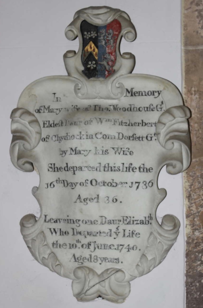 A touching memorial to my 7 x great grandmother Mary Fitzherbert and her daughter Elizabeth, commissioned by her husband, Thomas Woodhouse. The ornate nature of the memorial suggests that Thomas’ brewery business was doing well. And the coat of arms connects to the nobility.