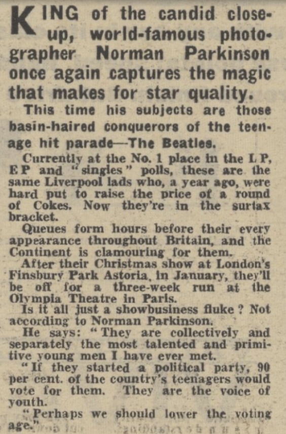 Where will the Beatles and the other Liverpool lads be this time next year? Most predict that they will still be riding high. However, some pop makers, like the Fourmost, are holding on to their day jobs, in case the Mersey roar becomes a whisper. This week’s number one, You’ll Never Walk Alone by Gerry and the Pacemakers.