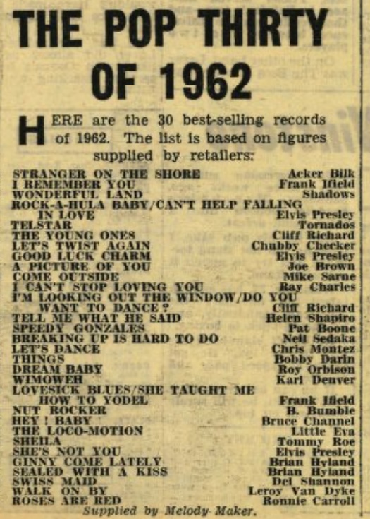 Patrick Doncaster predicts that the first hit of 1963 will be Diamonds by ex-Shadows Jet Harris and Tony Meehan. Other likely hits: The Alley Cat Song – David Thorne, The Hipster – Cyril Stapleton.