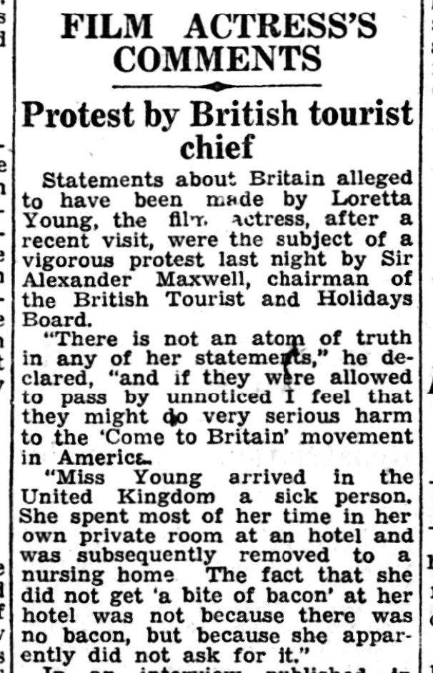 Loretta Young’s comments, featured on 27 January about the British people starving and shivering, were criticised by a British tourist official.