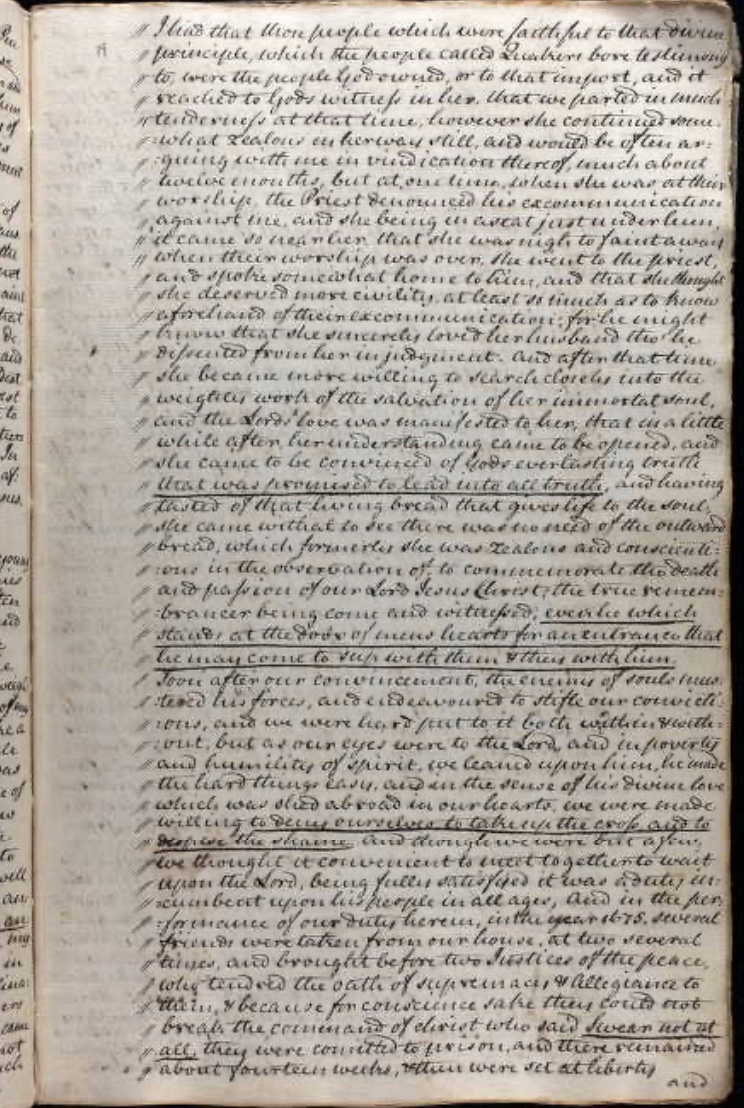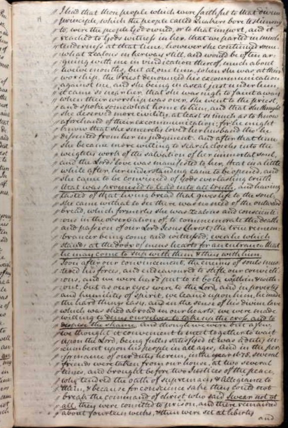 She was very careful and open-hearted to help the poor and the weak both amongst us and others. In her last sickness, she was sensible she was not likely to recover out of it and she was satisfied and contented therein to submit to the Lord’s will. Speaking to me, she said, “I take it as a great mercy that I am to go before thee, we are upward of 45 years married, and our love is rather more now towards each other than at the beginning.”