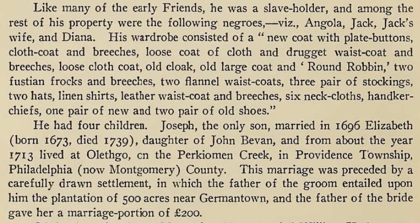 ‘North America, Family Histories, 1500-2000’ mentions my 9 x great grandfather John Bevan and his daughter Elizabeth in relation to a Samuel Richardson, in that Elizabeth married Samuel’s only son, Joseph, in 1696. The entry also mentions slave ownership and Samuel’s wardrobe. Many Quakers were anti-slavery, and from other entries I believe this was John Bevan’s stance. John gifted Elizabeth £200 for the marriage, the equivalent of £24,000 today.