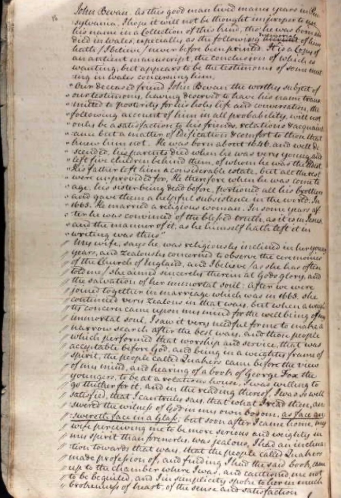 The opening paragraphs pay tribute to my 9 x great grandfather John Bevan while the remainder of the page is the first part of the transcription of his diary. John explains how he converted to Quakerism while the introduction states: “John Bevan…a good man…having deserved to have his name transmitted to posterity for his holy life and conversation.”