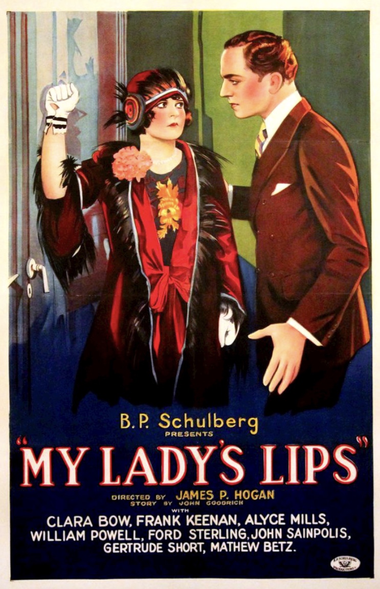 Clara Bow’s seventeenth movie was My Lady’s Lips, a silent drama released on July 1, 1925, that starred Alyce Mills. The film also featured William Powell, later to achieve fame in the Thin Man series, in his tenth movie role. Clara played Lola Lombard, the daughter of a newspaper magnet. Despite their overlapping careers, Clara and William Powell only worked on two movies together.
