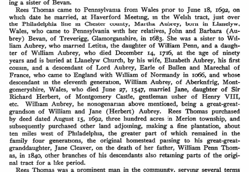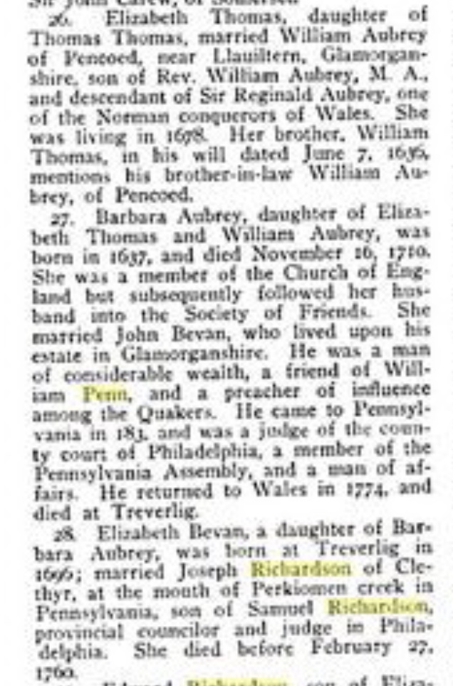 This entry in ‘The History of Bucks County’ mentions my 9 x great grandparents John Bevan and Barbara Aubrey. It also mentions their daughter, Elizabeth, and Barbara’s ancestors. The entry describes John as a ‘man of considerable wealth, a friend of William Penn, a preacher of great influence, and a judge at the County Court of Philadelphia.’