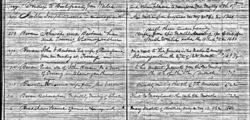 A grainy, but important image, a page from the Pennsylvania Quaker Meeting Records, which recorded my 9 x great grandfather John Bevan, his wife Barbara, and their ‘tender’ family’s arrival in Pennsylvania, 1683.