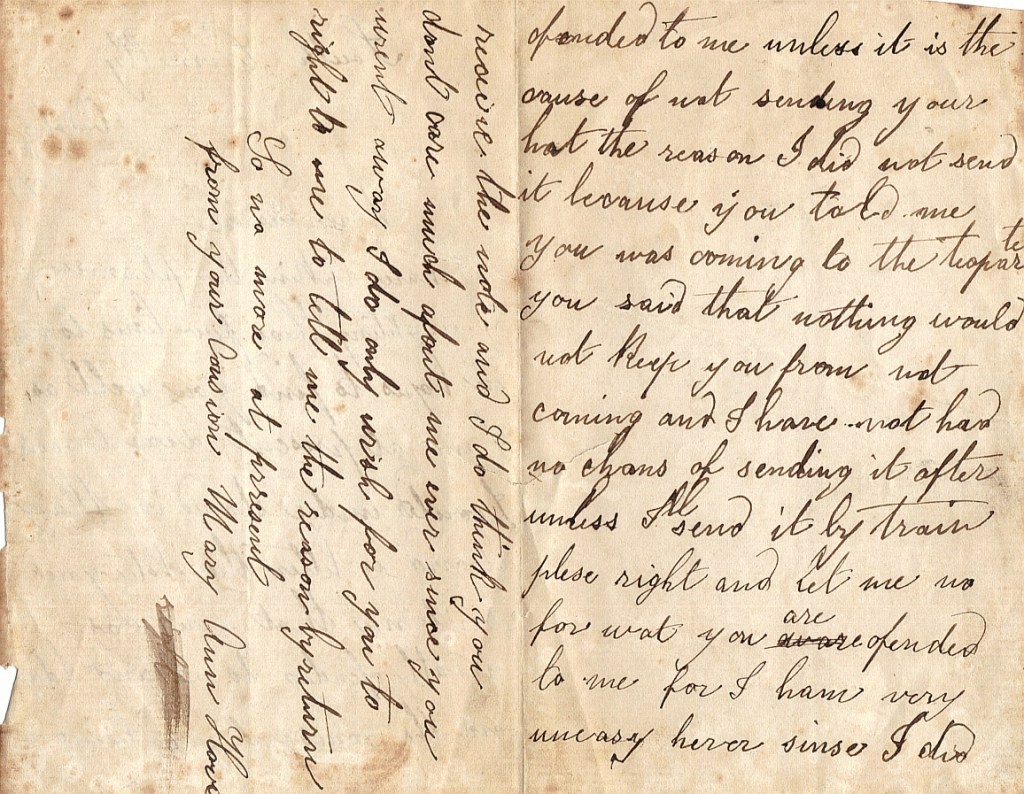 I have taken the pleasure of writing these few lines to you in hopes to find you well as I am at present. Dear Cousin I could understand in Mary David’s letter the note you sent me that you was greatly offended to me and I don’t know the cause of you being so offended to me unless it is the cause of not sending your hat. The reason I did not send it because you told me you was coming to the tea party. You said that nothing would not keep you from not coming and I have not had no chance of sending it after unless I send it by train. Please write and let me know for what you are offended to me for. I am very uneasy ever since I did receive the note and I do think you don’t care much about me ever since you went away. I do only wish for you to write to me to tell me the reason by return.