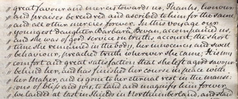 A transcribed page from my 9 x great grandfather John Bevan’s journal. In 1704, after twenty-one years in Pennsylvania, along with his wife Barbara and their youngest daughter Barbara, he returned to his estate in Wales. Sadly, daughter Barbara died. John wrote of her: “Her innocence and sweet behaviour preached truth wherever she came.”