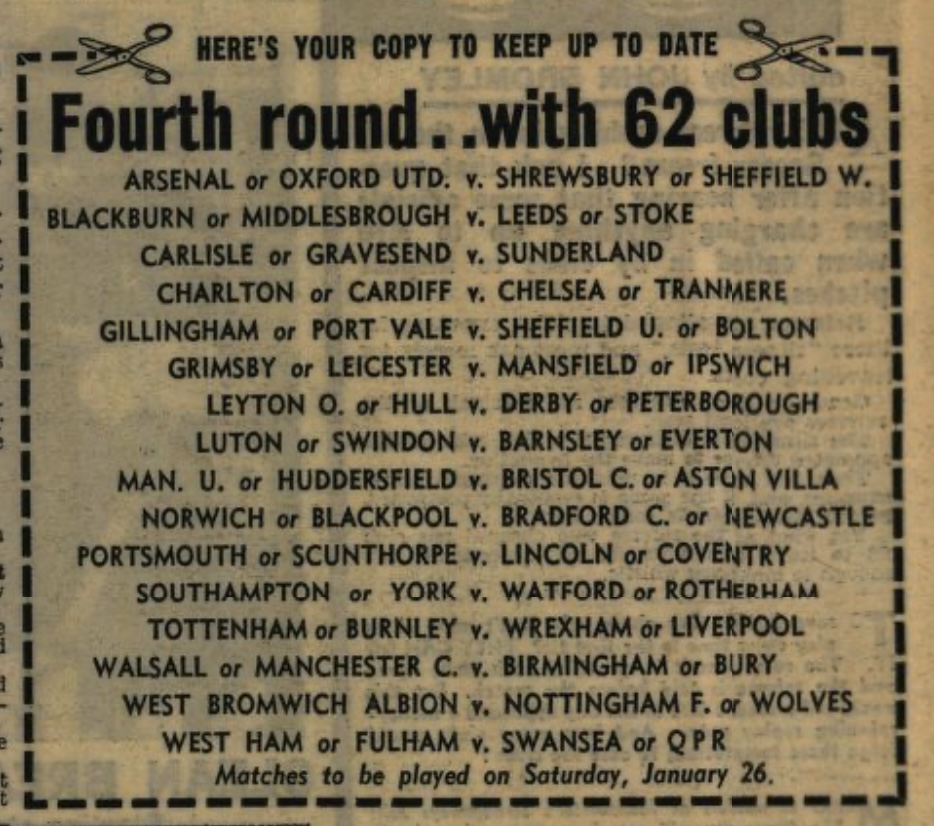 Because of the snow, only Sunderland and West Bromwich Albion cleared the FA Cup Third Round hurdle. Nevertheless, the Fourth Round draw went ahead as scheduled.