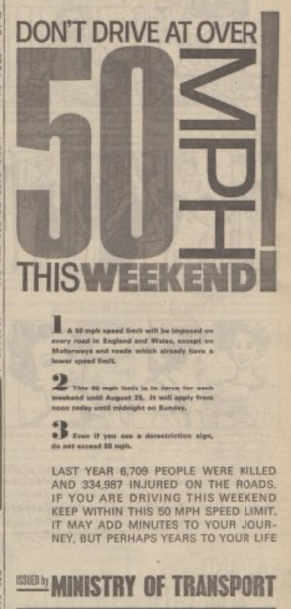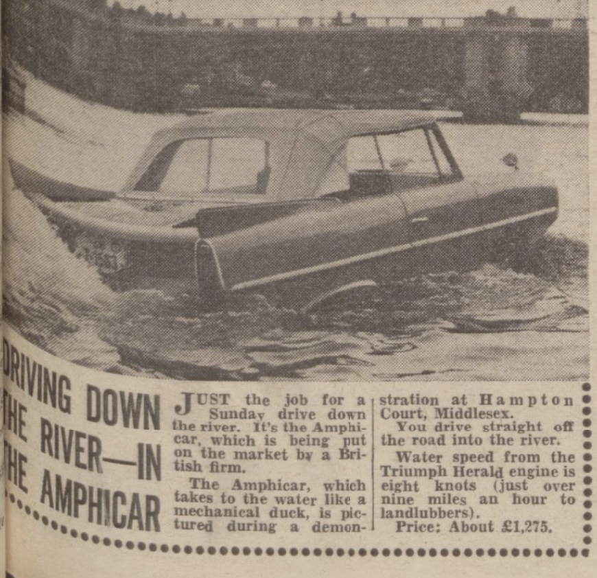 An incident in Gloucester resulted in a mini car being written off. Mr T Poole of Worcester was driving along a country road when a horse ran out from behind a gate. As if in play, the horse sat on his car, shattering the windscreen and crumpling the roof. The horse did not appear hurt.