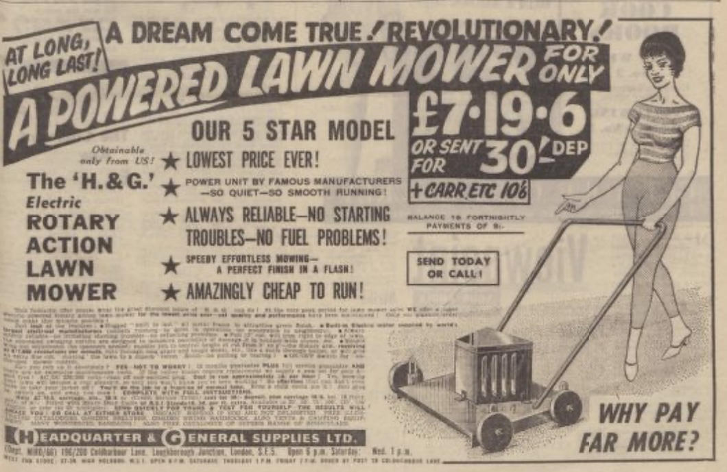 Battery-operated gadgets are set to replace items that rely on the mains. They include a magnetic torch, a battery gas lighter, an alarm clock radio, a transistorised four-speed record player, a battery shaver, a drink mixer, a battery toothbrush, and a portable tv run off rechargeable batteries.