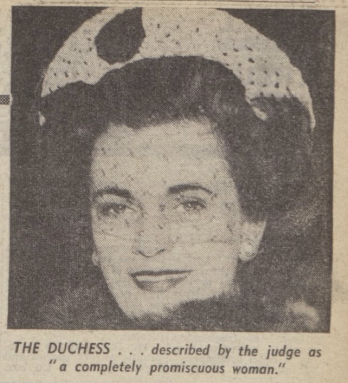 The Duchess of Argyll protested against the huge divorce bill she must pay – £50,000. She said, “I feel that as a woman I have the right to defend my fair name – without having to pay these vast costs.”