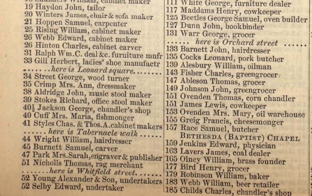 A post office directory from 1865 confirming that my 3 x great grandfather Richard Stokes was a furniture maker in Finsbury, London. From the 1600s every member of my Stokes family except one was a carpenter, originally based in Pangbourne (Richard’s father, William, was a weights and measures man, overseeing the distribution of corn as it arrived in London).