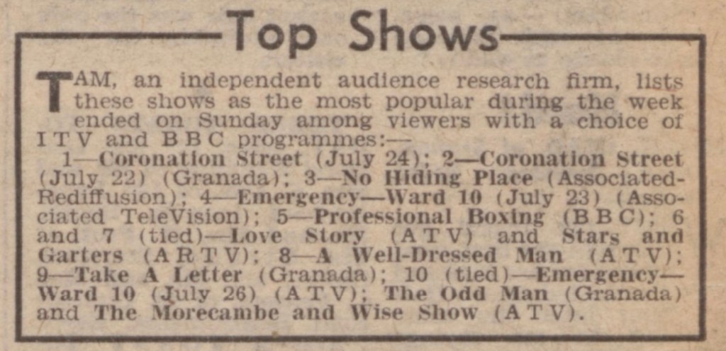 “Wednesday night and millions of soccer-loving working men were looking forward to the tele-recording of the Spurs-Manchester United European Cup game. Alas, it was postponed. Never mind, the BBC will show us a consolation. But what did we get? A documentary on work!” – John Griffiths, Bridgend, Glamorgan.